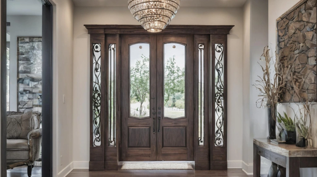 Di sisi kiri dan kanan pintu terdapat panel samping kaca yang dihiasi dengan ornamen besi tempa berwarna gelap, menambah sentuhan mewah dan artistik.