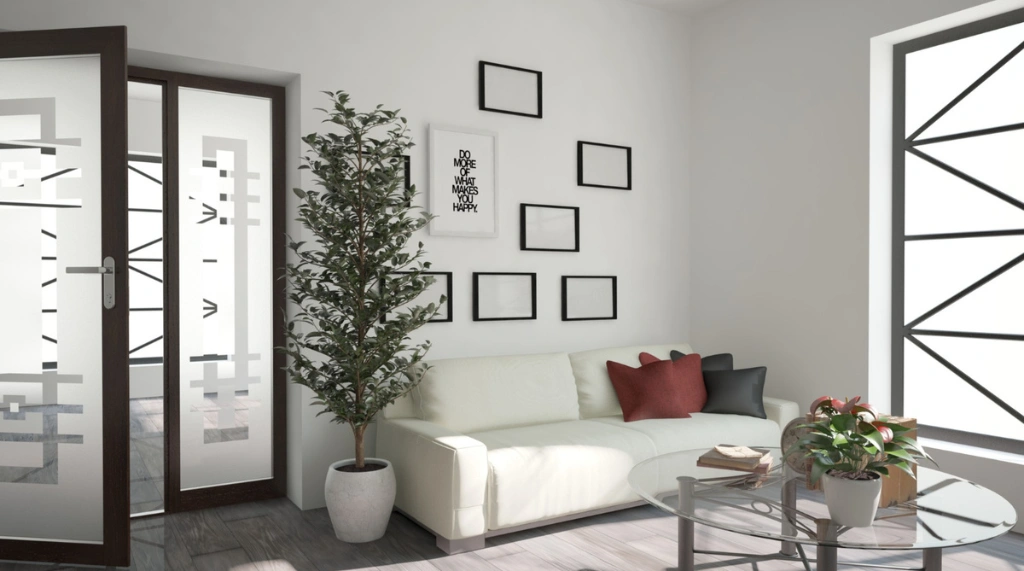 Pintu ini berpadu apik dengan skema warna minimalis di ruangan, menciptakan kontras yang kuat dengan dinding putih bersih. Kombinasi pintu gelap dengan dekorasi yang cerah memberikan kesan modern dan berkelas pada ruangan.