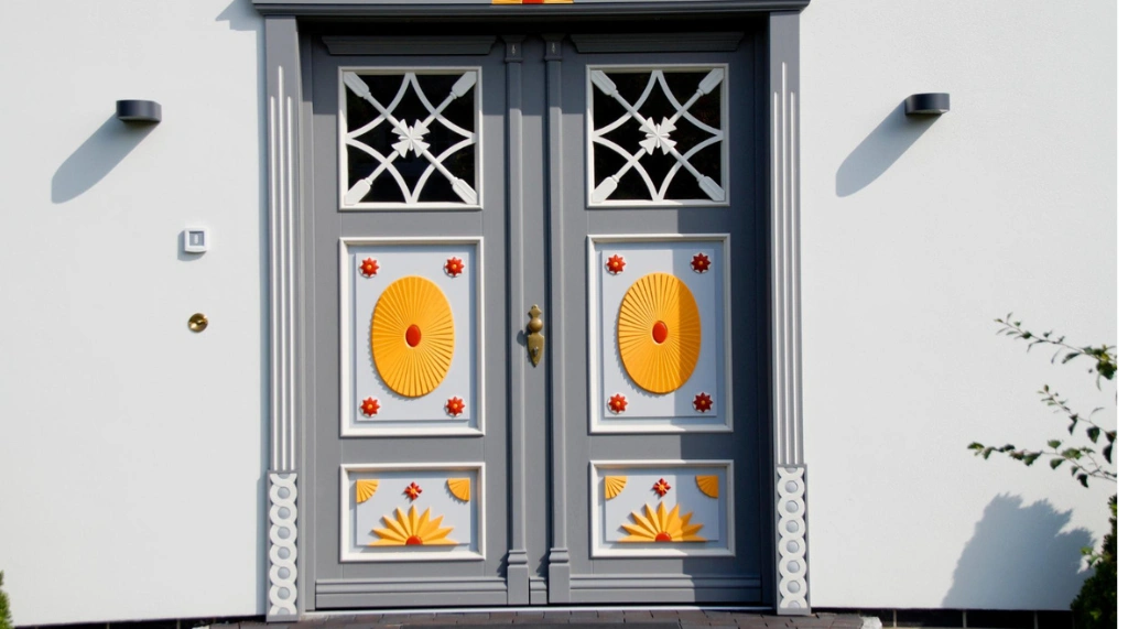 Pintu kupu tarung pada gambar ini memiliki model double door dengan bingkai berwarna abu-abu yang kalem. Pintu ini dihiasi dengan ornamen-ornamen unik berwarna oranye dan merah yang memberikan sentuhan cerah dan berkarakter.