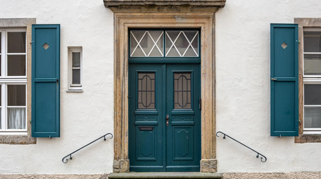 Warna hijau teal ini memberikan sentuhan berani dan berkarakter, berpadu apik dengan dinding putih dan bingkai pintu batu. Keserasian antara warna pintu dan jendela di sekitarnya menciptakan fasad yang unik dan estetik.