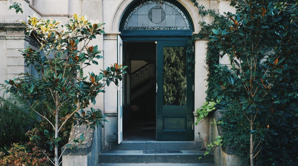 Pintu ini berpadu apik dengan fasad bangunan batu berwarna abu-abu, menonjolkan nuansa klasik dan formal. Desainnya yang kompleks dan ornamen ukiran pada pintu menjadikannya pusat perhatian, menunjukkan keindahan seni arsitektur yang kuat.