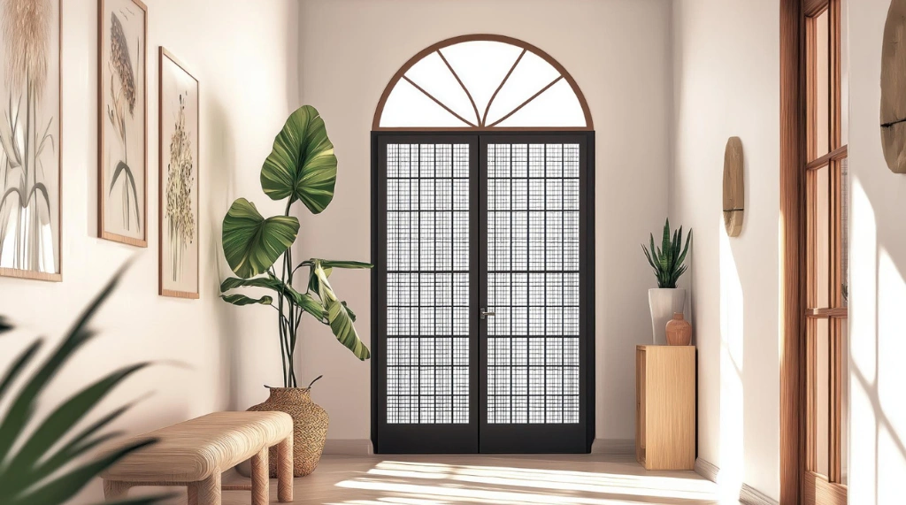 Bagian tengahnya adalah double door dengan panel kaca melengkung di bagian atas, memungkinkan cahaya masuk dan memberikan pandangan ke luar.