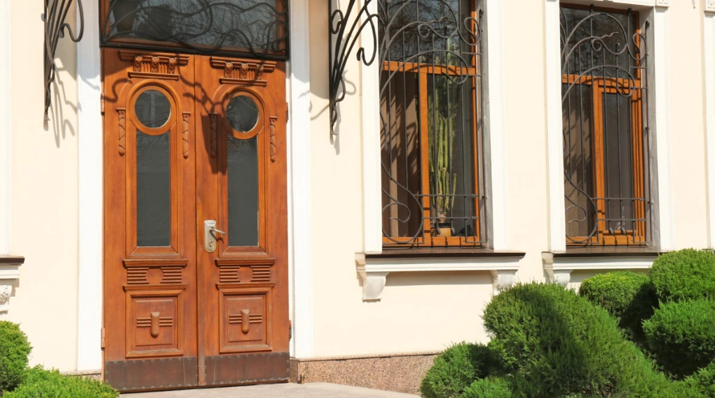 Pintu ini berpadu apik dengan dinding krem dan jendela berjeruji besi, menonjolkan nuansa klasik dan tradisional. Warna cokelat terang pada pintu memberikan kesan hangat, menciptakan fasad yang megah dan berkarakter.