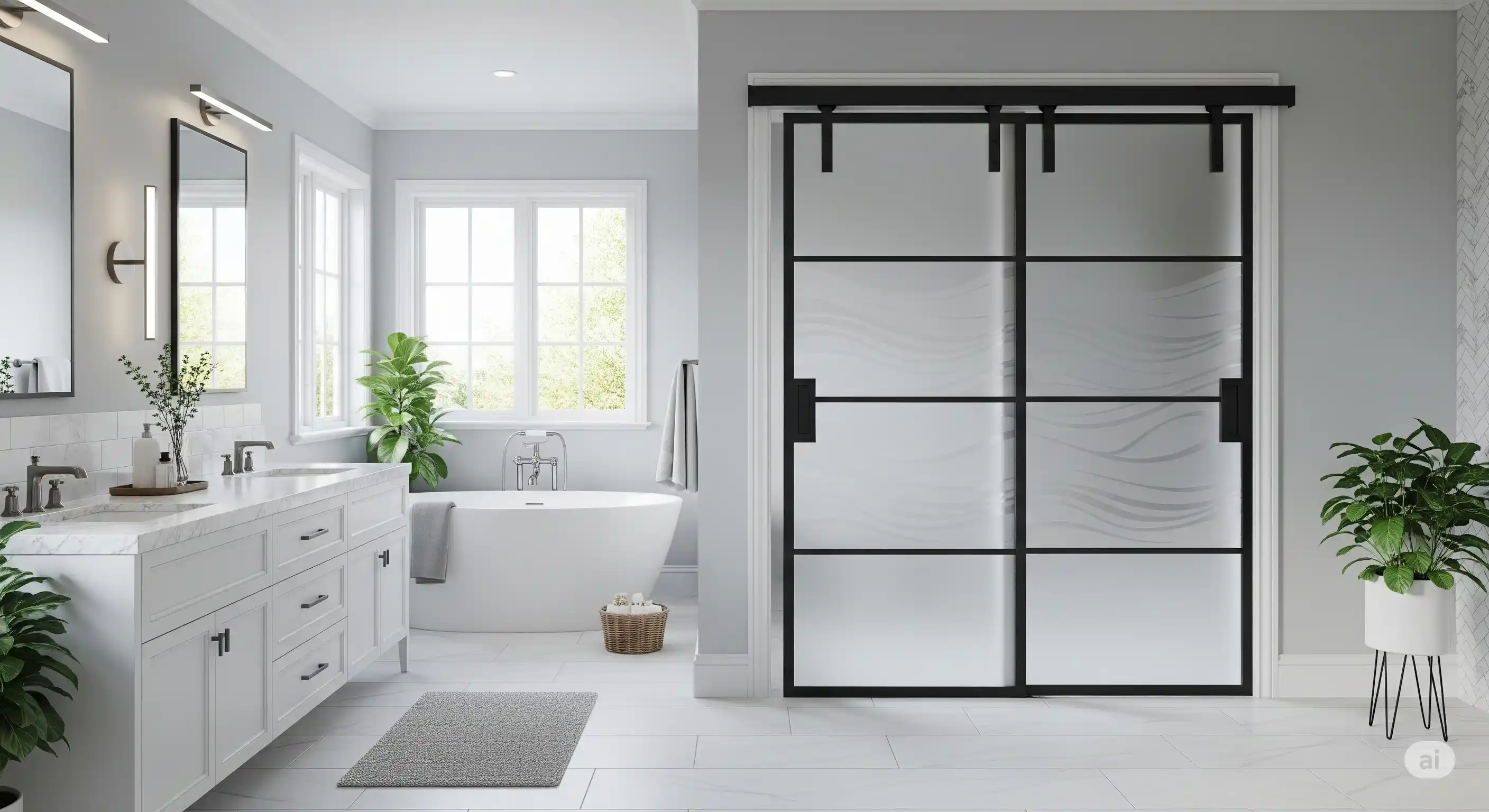 12. Pintu Geser Barn Door Aluminium untuk Kamar Mandi Utama