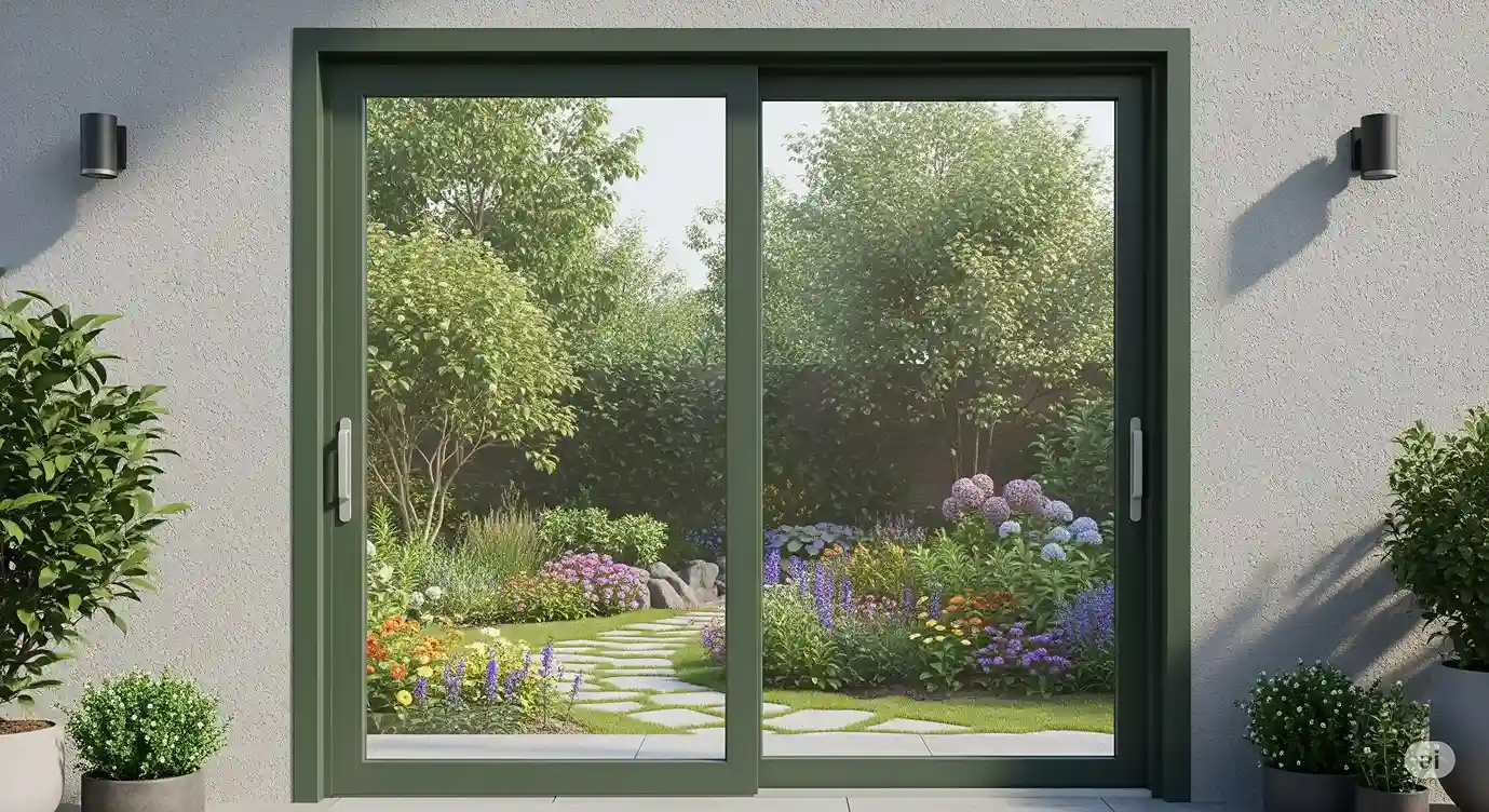 Frame aluminium berwarna hijau forest matte memberikan kesan alami yang menenangkan, berpadu serasi dengan pemandangan taman belakang yang rimbun dan penuh bunga melalui panel kaca bening.