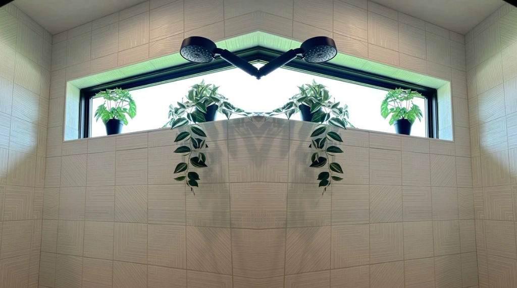 Bingkai hitam minimalis pada jendela memberikan kontras modern terhadap dinding keramik bertekstur garis, sementara cahaya alami yang masuk mempertegas detail artistik ruangan. Kombinasi tanaman hijau dan pencahayaan dari jendela atas ini berhasil menciptakan atmosfer kamar mandi yang lebih hidup, estetik, dan menenangkan.