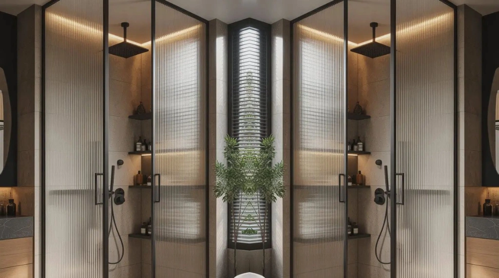 5. Sekat Kamar Mandi Sliding Kaca Fluted dengan Bingkai Hitam Industrial